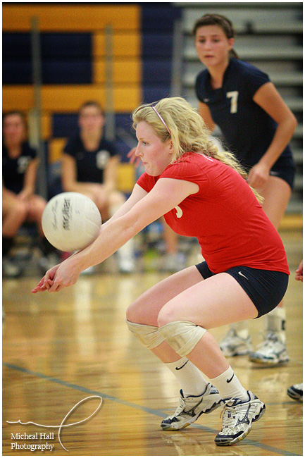 One fun thing about these images is that they will print BIG really well. They were photographed on the 21 million pixel Canon EOS 1Ds Mark III that I picked up at the end of club season this year. The camera is not considered a sports camera because it doesn't have a super fast frame rate (5 frames per second versus the 10 frames per second of the sports version 1D Mark III), but the fact is that - if your timing is good - you don't need a whole lot of frames to get good action. Volleyball is typically a single image per touch sport anyway, so 1Ds Mark III works well. Another accusation is that the 1Ds Mark III doesn't have good enough high ISO performance to photograph indoor sports. However, it performs very well up to its top ISO of 3200 and it has plenty of pixels - noise will be very minimal in prints.