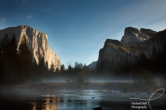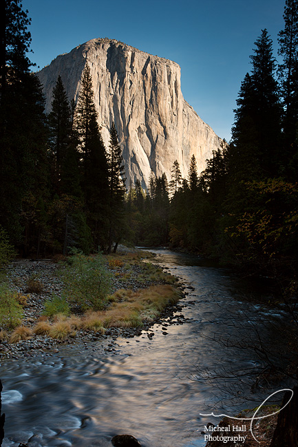 This image was the result of catching a fleeting glimpse of the river and El Cap as I drove the circuit of the valley. I pulled over the the shoulder and headed down the hillside towards a cliff about 20 feet high overlooking the river. The morning light on El Cap reflected into the waters of the river and made a really striking image.