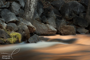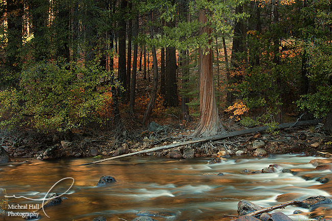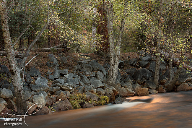 I spent my last evening wandering around the valley. I noticed some nice light on Half Dome and thought I might try for an image of it. However, I wasn't seeing anything worthwhile, so I kept wandering the river and wound up in a very quiet spot where I saw some incredible ligth on the water. It was a golden sparkle - a reflection from the light of the canyon wall behind the river that made the water look like molten copper. It was really gorgeous and I spent the last 45 minutes of the evening just sitting there watching the light change and listening to the water, occasionally making an image.
